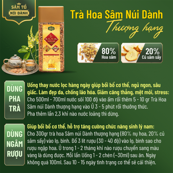 * Dùng pha trà uống thay nước lọc hàng ngày giúp bồi bổ cơ thể, ngủ ngon, sâu giấc. Làm đẹp da, chống lão hóa. Giảm căng thẳng, mệt mỏi, stress:Cho 500ml – 700ml nước sôi 100 độ vào ấm rồi thêm 5 – 10 gr Trà Hoa Sâm núi Dành thượng hạng vàoỦ 3 – 5 phút rồi thưởng thức.Pha thêm lần 2,3 khi nào nước loãng thì dừng*Dùng ngâm rượu giúp bồi bổ cơ thể, hỗ trợ tăng cường chức năng sinh lý nam:Cho 300gr trà hoa Sâm núi Dành thượng hạng (80% nụ hoa, 20% củ sâm sấy) vào lọ, bìnhĐổ 3 lít rượu (30 – 40 độ) vào bình, lọ sao cho rượu ngập hoaỦ trong 1 – 2 tháng khi nào rượu trong bình, lọ chuyển sang màu vàng là dùng đượcMỗi lần Uống 1 – 2 chén (~30ml) sau ăn. Ngày không quá 100ml. Sau 10 – 15 ngày tình trạng cơ thể sẽ cải thiện