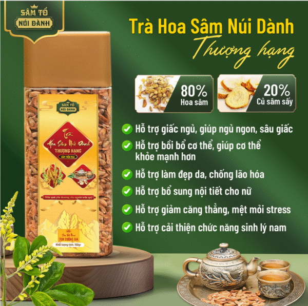 Hoa sâm Nam là phần chính trong trà, chứa nhiều hợp chất chống oxy hóa giúp ngăn ngừa tổn thương từ các gốc tự do. Hoa sâm còn có tính kháng viêm, giúp giảm stress và bảo vệ tế bào khỏi sự tác động của tuổi tác. - 20% Củ Sâm 7 Năm Tuổi Sấy Khô